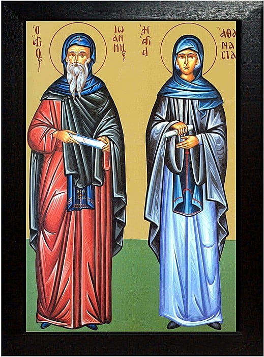 Căci un neam de barbari, ce se numeau mauri, fără de veste au năvălit asupra ţării acesteia şi era nevoie ca bărbatul Atanasiei să meargă la război, unde, după neştiute judecăţi ale lui Dumnezeu, a fost ucis cu sabia de barbari. Deci, după uciderea bărbatului Atanasiei, ea s-a apucat iarăşi de scopul ei cel mai dinainte, ca să se ducă în mănăstire, însă mai înainte de a săvârşi lucrul acela, a venit o poruncă de la împăratul în părţile acelea, ca fecioarele şi văduvele cele tinere să se ducă după ostaşii lui. Şi iarăşi a fost silită de părinţii săi, ca să se mărite după alt bărbat. Şi deşi acea nuntă s-a făcut, ea se îngrijea pentru a sa mântuire, îndeletnicindu-se fără de lenevire în cântarea de psalmi şi în citirea cărţilor. Apoi cu nici un fel de dulceţi ale lumii acesteia sau de grijile bunătăţilor celor vremelnice schimbându-se, se lumina prin smerenia inimii cu cuvio-şie şi era foarte iubită de casnicii săi şi lăudată de vecinii cei ce îi vedeau bunătatea. Iar spre darea milosteniei era atât de osârdnică, încât, deşi era plină de toate bunătăţile casa ei, acelea nu-i erau destule spre împărţire. Şi pe toţi cei ce mergeau în casa ei, monahi şi străini, îi primea cu cinste şi-i odihnea cu iubire de străini, apoi văduvelor, sărmanilor şi tuturor celor ce aveau trebuinţă, le dădea din destul cele trebuincioase vieţii.