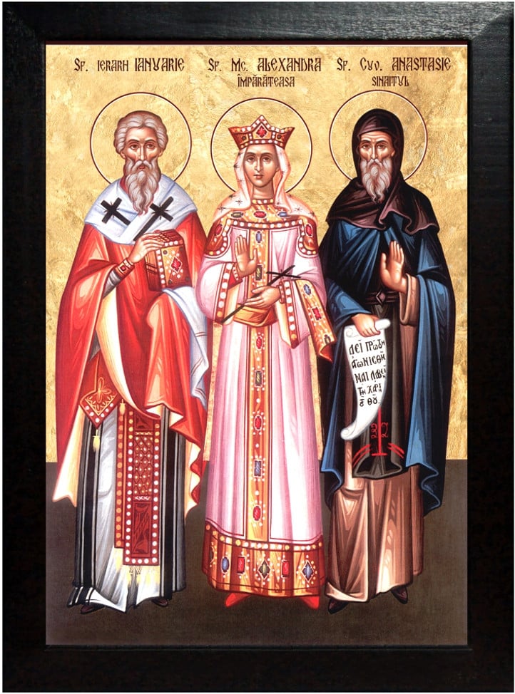 Alexandra, muceniţa lui Hristos Dumnezeu, era soţia împăratului Diocleţian. Deci văzând ea că Sfântul Gheorghe era chinuit în felurite chipuri spre moarte, dar că în chip minunat rămâne viu şi sănătos, s-a înfăţişat înaintea împăratului, în vreme ce el aducea jertfă idolilor, şi s-a mărturisit pe sine creştină; pentru aceea a fost pusă în închisoare. După ce a fost închisă, s-a dat hotărâre ca să fie tăiaţi cei doi, Gheorghe şi Alexandra. Aflând ea această hotărâre a împăratului, în închisoare s-a rugat lui Dumnezeu şi şi-a dat sufletul.