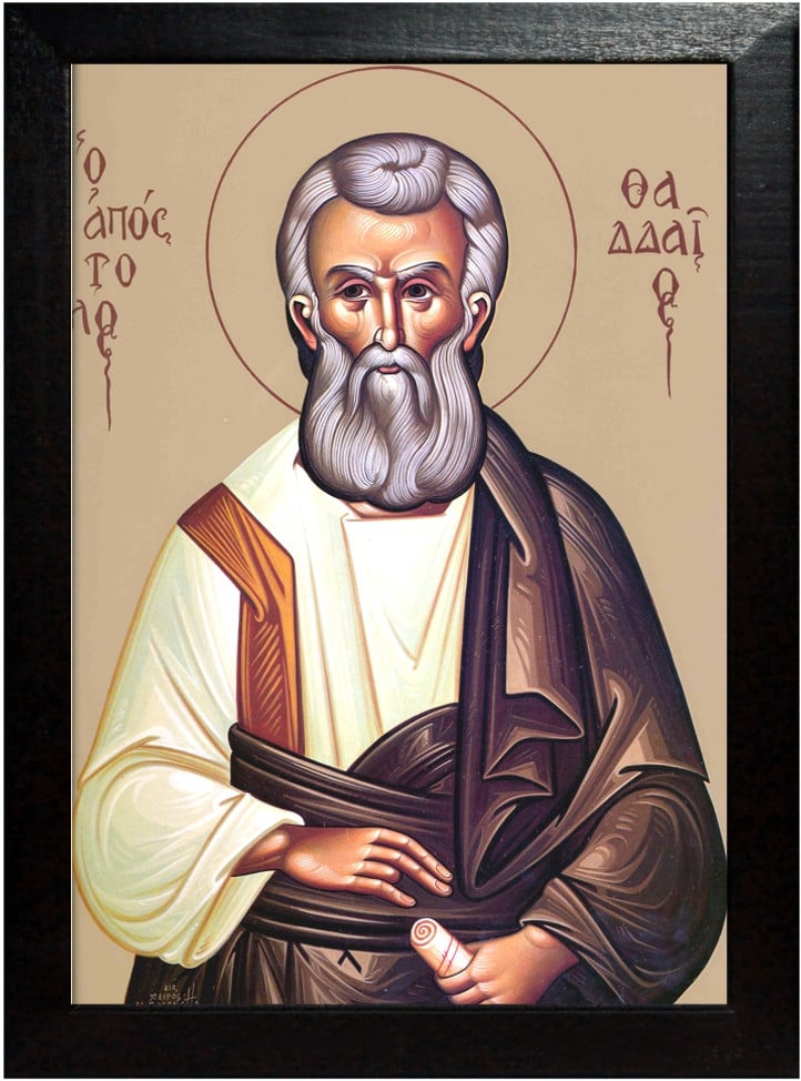 Iar după pătimirea cea de bunăvoie, după moartea Domnului şi după învierea cea de a treia zi şi înălţarea Lui la ceruri, Sfinţii Apostoli împărţindu-se în toată lumea la propovăduire, Sfântul Tadeu s-a dus la Edesa, trimis fiind de Domnul. Pentru că aşa a făgăduit Domnul lui Avgar, domnul Edesei, mai înainte de patima Sa cea de bunăvoie, trimiţându-i pe mahramă închipuirea cea ne făcută de mână a Preasfintei Sale feţe şi scriind către dânsul: „Când mă voi înălţa la Tatăl, voi trimite la tine pe unul din ucenicii Mei, care te va tămădui desăvârşit de boala care te-a cuprins pe tine şi îţi va da viaţă veşnică ţie şi celor ce sunt cu tine".
