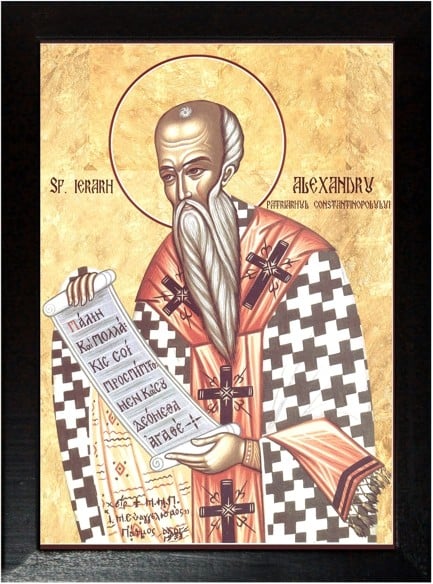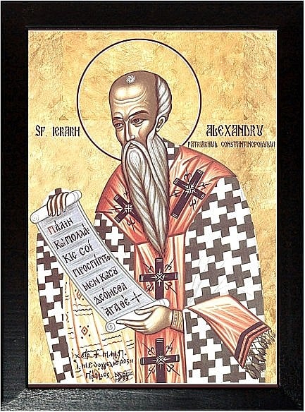 Sfîntul Alexandru a fost protopop şi horepiscop pe vremea Sfîntului Mitrofan, întîiul Patriarh al Constantinopolului, fiind înfrumuseţat cu toate faptele bune. Cînd s-a adunat în Niceea întîiul Sinod a toată lumea, al Sfinţilor Părinţi, Patriarhul Mitrofan, neputînd să se ducă la acel sobor, din pricina bătrîneţilor şi slăbiciunii trupeşti, a trimis pe acest Alexandru, apărător al dreptei credinţe. El, şezînd în sobor în locul patriarhului său, s-a luptat mult pentru dreapta credinţă împotriva răucredinciosului Arie. După săvîrşirea Sinodului, Alexandru întorcîndu-se din Niceea în Constantinopol, îngerul Domnului s-a arătat fericitului Mitrofan, spunîndu-i că i se apropie sfîrşitul şi poruncindu-i să-l lase după sine ca patriarh pe Alexandru, zicînd: "După zece zile îţi vei lua cununa de la Dumnezeu, iar scaunul bisericesc să-l ia, în locul tău, Alexandru, slujitorul tău".