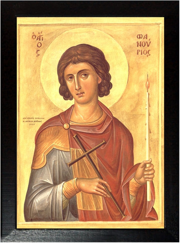 Una dintre aceste icoane era bine păstrată şi reprezenta un tînăr militar care ţinea în mîna sa dreaptă o cruce. În jurul icoanei erau reprezentate 12 scene din martiriul său. Episcopul locului, Nil (1355-1369), a descifrat inscripţia de pe icoană: "Sfîntul Fanurie". Acest nume nu se găseşte însă în martirologii şi sinaxare.