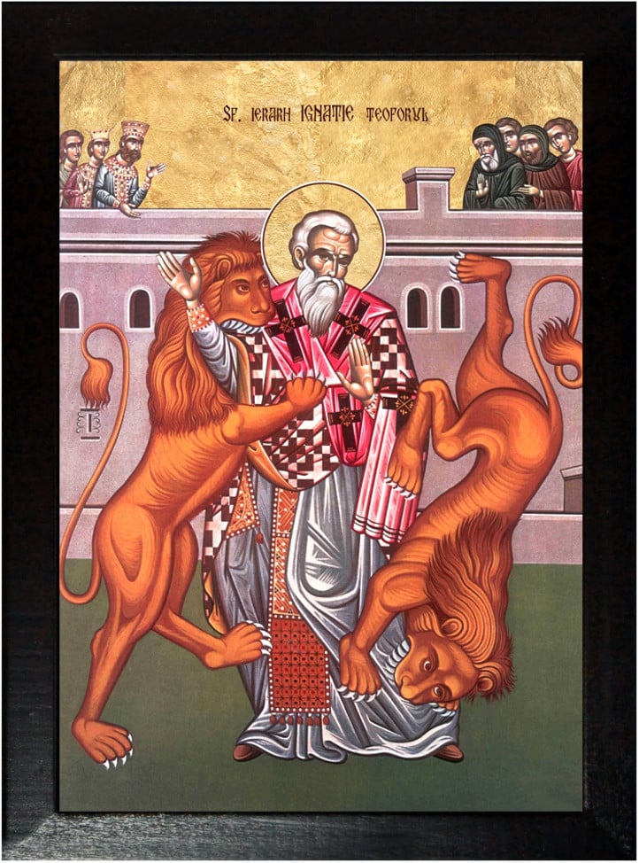 Sfîntul Ignatie adus în mijlocul priveliştii s-a întors către popor cu suflet bărbătesc şi cu faţa luminată şi binevoind acea moarte de ocară primită pentru Hristos, cu mare glas a strigat: "Bărbaţi romani, care priviţi la această nevoinţă a mea, să ştiţi că nu pentru oarecare facere de rău primesc această muncă, nici pentru oarecare nelegiuire sînt osîndit la moarte. Ci numai pentru singur Dumnezeul meu, de a cărui dragoste sînt cuprins şi pe Care fără de saţ Îl doresc, căci sînt grîu al Lui şi voiesc să mă macin prin dinţii fiarelor, ca să mă fac Lui pîine curată". Acestea zicînd sfîntul, au venit asupra lui leii, care îndată l-au sfîşiat şi l-au mîncat rămînînd numai oasele.