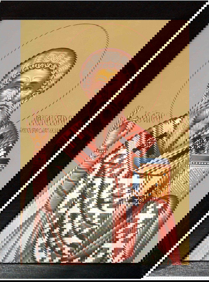 Arhidiaconul, văzînd aceea, a lăsat gura sfîntului şi i-a apucat mîna, oprind-o de la o închipuire ca aceea a Sfintei Treimi. Iar sfîntul, avînd gura slobodă şi dreapta fiindu-i ţinută, binecuvînta Treimea într-o unime şi unimea în Treime şi sfătuia poporul care asculta ca să se ţină de mărturisirea cea întărită de Sinodul de la Niceea. Şi îi încredinţa că cel ce leapădă dogmele Sinodului din Niceea, acela cu adevărat este rătăcit cu totul. Arhidiaconul, astupînd iarăşi gura arhiepiscopului, nu-l lăsa să închipuie nici prin degete Treimea; iar arhiereul, smucindu-se, învăţa poporul, cînd cu gura, cînd cu degetele.