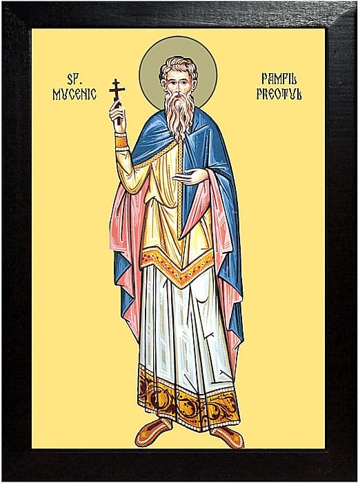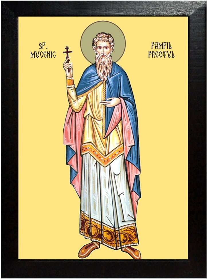 Sfantul Pamfil era de neam din Beirut, deprins din tinereţe cu înţelepciunea cea din afară, plin de duhovnicească filosofie, deosebit prin viaţa îmbunătăţită şi slăvit prin mărturisirea Domnului Hristos.