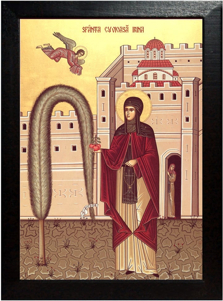 Sfânta Irina s-a născut în secolul al IX-lea într-o familie bogată din Capadocia. După moartea soțului ei, împărăteasa Teodora a condus Imperiul Bizantin ca regentă pentru tânărul ei fiu, Mihail. Teodora a sprijinit Biserica împotriva ereziei iconoclaste și a restabilit cultul sfintelor icoane.