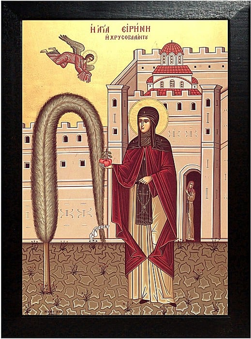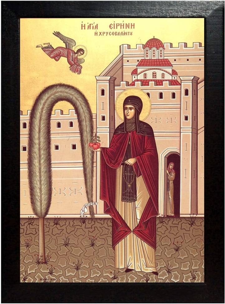 Sfanta Irina fecioară foarte frumoasă, născută din părinţi de neam bun, au luat-o oamenii împărăteşti, bucurându-se şi nădăjduind că ea are să se facă împărăteasă.