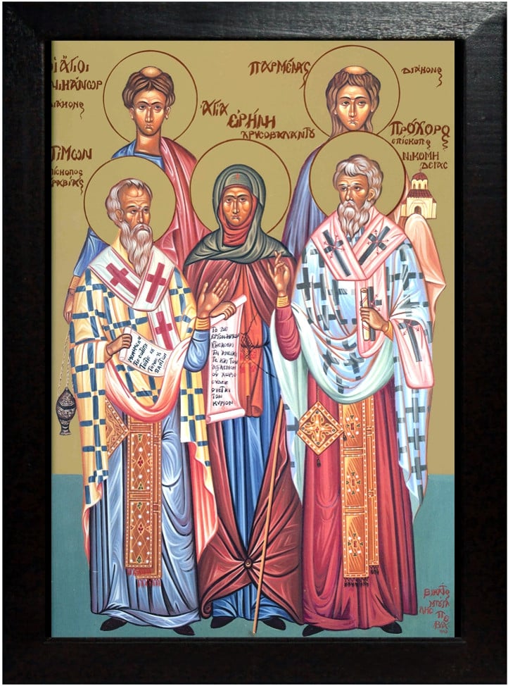 In zilele Sfinţilor Apostoli, după Inălţarea Domnului şi după primirea Sfântului Duh, pe când încă nu se răspândiseră ei prin toată lumea la propovăduirea lui Hristos şi bisericile credincioşilor din Ierusalim se înmulţiseră, s-au ales spre slujba diaconiei aceşti şapte bărbaţi plini de Sfântul Duh şi de înţelepciune: Ştefan, Filip, Prohor, Nicanor, Timon, Parmena şi Nicolae Antiohianul. Şi rugându-se Sfinţii Apostoli, şi-au pus mâinile peste dânşii şi i-au făcut diaconi. Dintre aceştia, pomenirea Sfântului Intâiului Mucenic şi Arhidiacon Ştefan se cinsteşte la 27 decembrie, a Sfântului Filip la 11 octombrie, iar pomenirea celorlalţi - afară de Nicolae, care nu este scris în numărul sfinţilor -, Sfânta Biserică s-a obişnuit a o prăznui în ziua de astăzi, deşi ei s-au săvârşit prin pătimire în vremi osebite, propovăduind apostoleşte pe Hristos în felurite locuri.