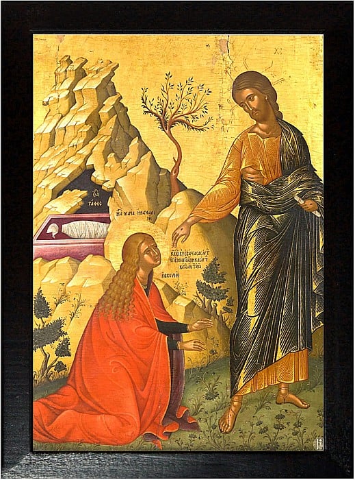 Maria Magdalena a fost prima care a vestit ucenicilor Învierea, dar aceștia nu au crezut-o inițial. Din devotament și dragoste pentru Hristos, ea s-a întors de trei ori la mormânt, văzându-l pe Domnul înviat, deși la început nu L-a recunoscut. După ce Hristos i-a vorbit și a numit-o pe nume, ea L-a recunoscut și a încercat să-I cuprindă picioarele, dar a fost oprită de Domnul, care i-a spus: "Nu te atinge de Mine!".