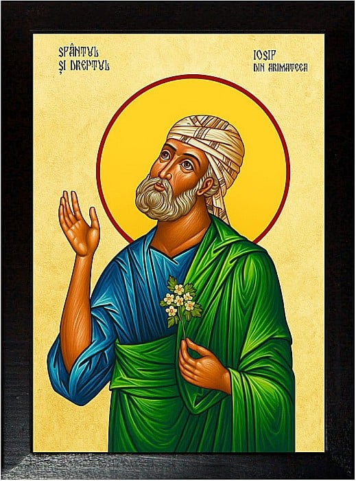 Sfantul Iosif din Arimateea era originar din seminţia lui Efraim. A fost un om bogat, ucenic în taină al Mântuitorului Iisus Hristos. Sfântul Iosif a fost cel care s-a ocupat de îngroparea Mântuitorului Iisus Hristos. După ce a cerut lui Pilat trupul Mântuitorului, împreună cu Nicodim au dat jos trupul Mântuitorului Iisus Hristos de pe cruce, l-au învelit în giulgiu alb şi l-au aşezat în mormânt nou săpat în piatră pe care Sfântul Iosif îl pregătise pentru sine.