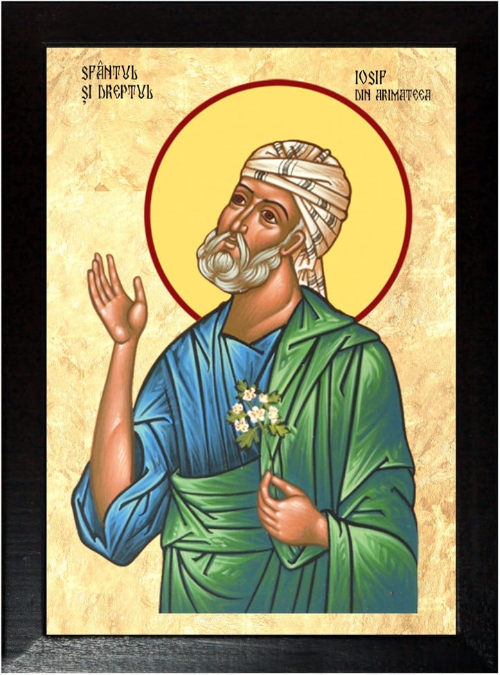 Sfantul Iosif din Arimateea era originar din seminţia lui Efraim. A fost un om bogat, ucenic în taină al Mântuitorului Iisus Hristos. Sfântul Iosif a fost cel care s-a ocupat de îngroparea Mântuitorului Iisus Hristos. După ce a cerut lui Pilat trupul Mântuitorului, împreună cu Nicodim au dat jos trupul Mântuitorului Iisus Hristos de pe cruce, l-au învelit în giulgiu alb şi l-au aşezat în mormânt nou săpat în piatră pe care Sfântul Iosif îl pregătise pentru sine.
