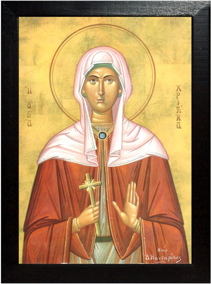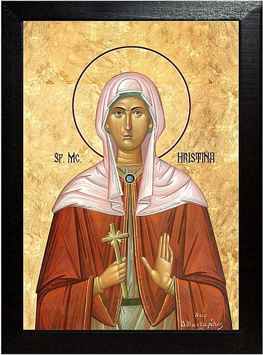 Sfanta Hristina a fost din cetatea Tirului, pe vremea împărăţiei lui Septimiu Sever (193-211), fiică a unui general, Urban, care trăia cu familia în palatul său. Că unul ce rânduise ca fiica lui, Hristina, să slujească de-a pururea în templul zeilor păgâni, Urban i-a dăruit, ca locuinţa fiicei sale, împreună cu slugile ei de credinţă, cel mai înalt turn al palatului său, aşezaţi acolo şi zeii săi din aur şi din argin, împodobiţi cu multe podoabe, ca, zilnic, să le poată aduce jertfe şi rugăciuni. Dar, fecioară, suflet curat, privind în fiecare noapte cerul înstelat, a înţeles că idolii cei neînsufleţiţi şi făcuţi de oameni, nu au nici o putere, ci Acela, Care a făcut şi tine toate, Acela este Dumnezeu cel adevărat. Ascultând, deci, de glasul inimii sale, Hristina a sfărâmat idolii cei neînsufleţiţi, dăruind, prin slugile sale, sfărâmăturile, săracilor.