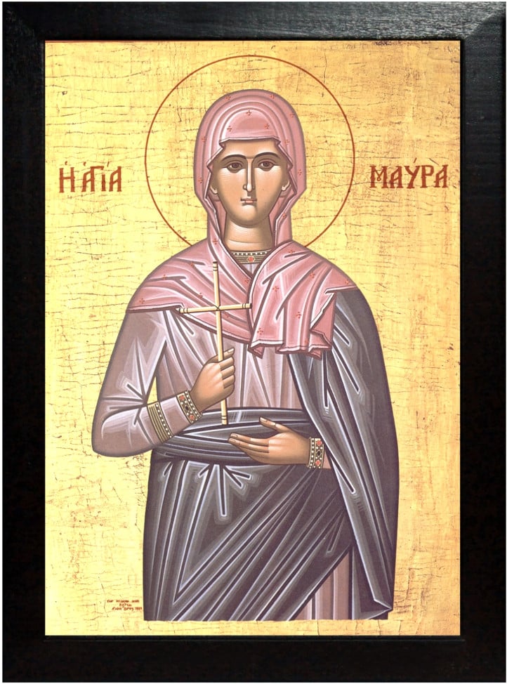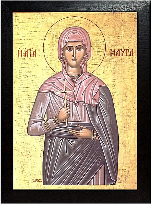 Nişte cuvinte ca acestea auzindu-le ighemonul, s-a înspăimântat şi totodată s-a aprins de mânie şi a poruncit să aducă o făclie plină de pucioasă şi de smoală, ca să ardă pe muceniţă. Iar poporul care stătea împrejur, a strigat cu glas mare către ighemon, zicând: „Până când vei scorni munciri noi asupra acestei tinere fecioare? încetează de acum să te mânii, ighemoane, căci ne mirăm foarte de răbdarea ei". Iar Sfânta Mavra, întorcându-se către popor, a zis: „Fiecare din voi să-şi caute de lucrurile sale: bărbaţii să se îngrijească de lucrurile cele bărbăteşti, iar femeile să facă lucrurile lor cu curăţie şi cu blândeţe. Iar pentru mine nimeni să nu se îngrijească, pentru că eu n-am trebuinţă de nici un sprijin sau ajutor de la voi, căci Dumnezeu, spre Care nădăjduiesc, este sprijinitorul meu".