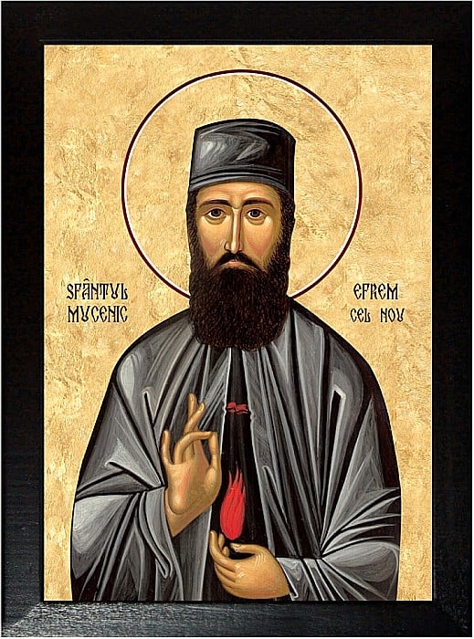 Sfantul Efrem cel Nou – Marele Mucenic, Marele Tămăduitor, Grabnicul Ajutător întru toate nevoile și Marele Făcător de minuni – s-a născut în Grecia pe data de 14 septembrie 1384 (de ziua Sfintei Cruci). Sfântul Efrem cel Nou a rămas orfan de tată încă de mic copil, astfel că el împreună cu ceilalți 6 frați ai săi au fost îngrijiți numai de mama sa evlavioasă. La vârsta de 14 ani, Sfântul Efrem cel Nou a intrat ca monah in Mănăstirea Preasfintei Născătoare de Dumnezeu de pe Colina Neprihăniților, din regiunea grecească Attica (de lângă localitatea Nea Makri).