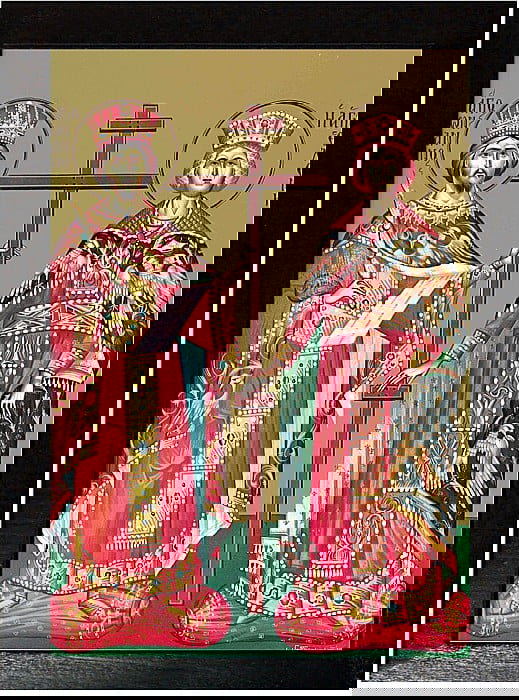 Apoi l-a întrebat pe dînsul, zicînd: "Sînt la voi oarecare dumnezei cu numele Petru şi Pavel?" Silvestru a răspuns: "Îm-părate, unul este la noi Dumnezeu, Care a zidit cerul şi pămîntul şi toate cele ce sînt pe dînsul. Iar aceia cărora tu le zici Petru şi Pavel, nu sînt dumnezei, ci robi ai lui Dumnezeu, care au propovăduit în toată lumea numele lui Iisus Hristos şi mai pe urmă şi-au vărsat sîngele lor pentru Domnul, fiind ucişi de către Nero". Auzind aceasta, împăratul s-a bucurat foarte mult şi a zis: "Rogu-mă ţie, episcope, arată-mi mie asemănarea lor, dacă o ai pe icoane închipuită, ca mai cu încredinţare să ştiu de sînt aceia ce mi s-au arătat mie în vis". Atunci Silvestru a trimis îndată un diacon să aducă icoana Sfinţilor Apostoli Petru şi Pavel. Deci, văzînd împăratul închipuirile feţelor apostoleşti, a zis: "Cu adevărat aceştia sînt, cei văzuţi de mine!"