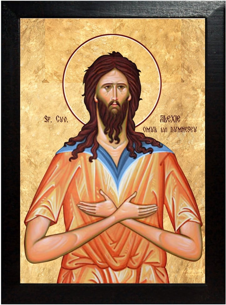 Soţia lui se numea Aglaida, femeie binecredincioasă şi temătoare de Dumnezeu, milostivă şi îndurătoare către săraci; însă fiind stearpă, se ruga lui Dumnezeu, zicînd: "Doamne, pomeneşte-mă pe mine, nevrednica roaba Ta, şi dezleagă-mi nerodirea, ca să mă învrednicesc a mă numi şi mamă de fii; dă-ne fii, ca să putem avea mîngîiere în viaţa noastră, împreună cu bărbatul meu, şi sprijinitor la bătrîneţile noastre". Aducîndu-şi aminte Dumnezeu de dînsa, după mila Sa, a dăruit rod pîntecelui ei, că a născut fiu; şi s-a veselit bărbatul ei şi au botezat pe prunc, numindu-l Alexie. Iar cînd a fost pruncul de şase ani, l-au dat să înveţe carte şi în grabă a învăţat gramatica, retorica şi cărţile bisericeşti. Apoi şi Scriptura dumnezeiască învăţînd-o bine, s-a făcut înţelept tînărul. Deci, socotind deşertăciunea lumii, şi-a pus în gînd să se lepede de bunătăţile cele vremelnice ale acestei vieţi, ca să moştenească pe cele veşnice. Şi a început a-şi osteni trupul, purtînd în taină o haină aspră pe trupul său.