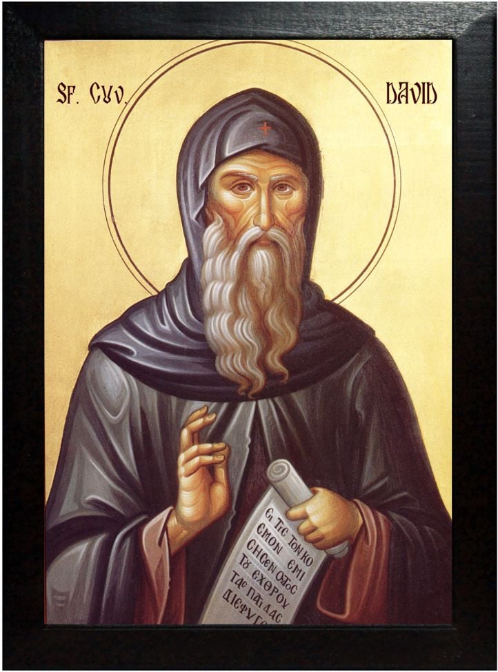 Sfantul David din Evvia este unul dintre cei mai mari sfinţi făcători de minuni. A fost numit "Bătrânul" încă din tinereţea sa, datorită sporirii sale duhovniceşti. I s-a spus "copilul Înaintemergătorului" datorită legăturii strânse pe care a avut-o cu Sfântul Ioan Botezătorul, care i s-a arătat de multe ori, în chip minunat, încă din fragedă copilărie, şi l-a călăuzit pe scara desăvârşirii.