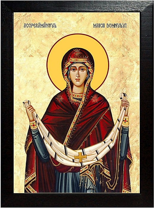 Prea Curata şi prea Binecuvîntata Fecioară Maria, Maica Domnului, ne dă nouă Acoperământul spre apărare, ca din toate primejdiile să ne scape pe noi de foamete, de ciumă şi de cutremure să ne apere, de războaie şi de răni să ne acopere şi să ne păzească pe noi sub Acoperământul său nevătămaţi.