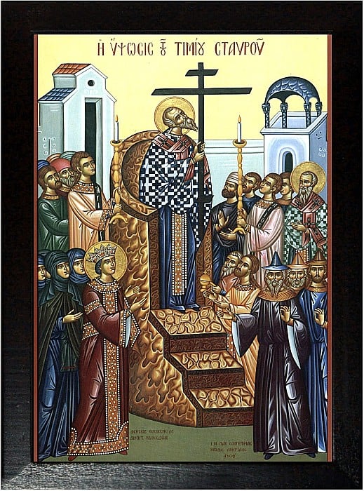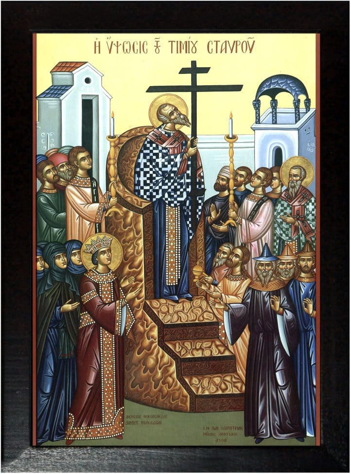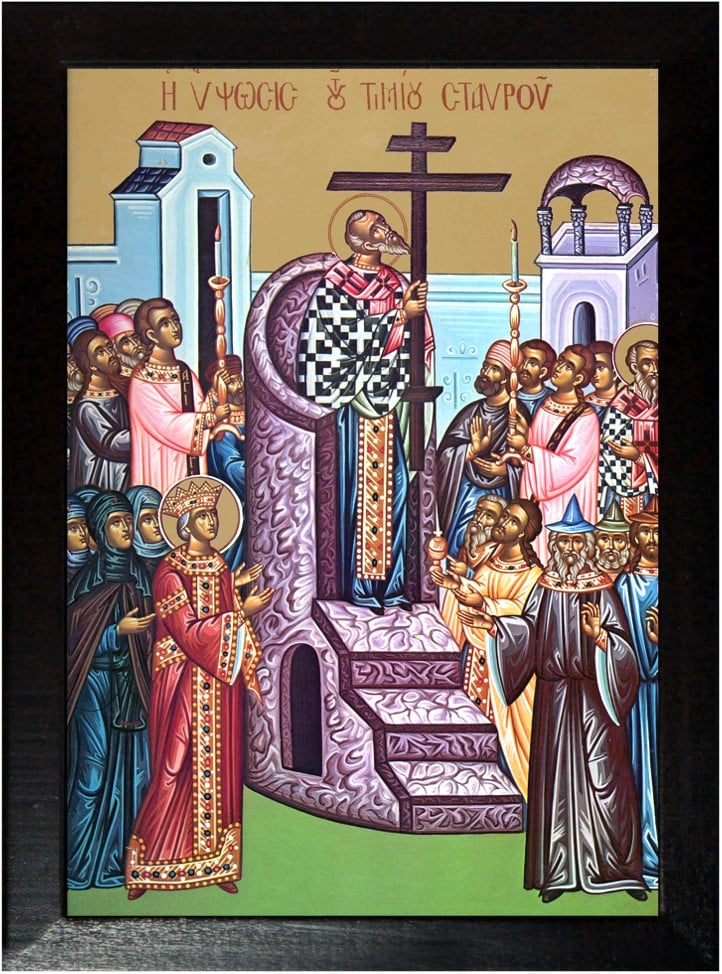 Deci, împărăteasa primind cu bucurie cinstita cruce, i s-a închinat şi a sărutat-o; asemenea şi toată suita împărătească, ce era cu dînsa. Iar alţii nu puteau să vadă şi să sărute sfînta cruce în acea vreme, din pricina mulţimii celei mari de lume, şi au dorit ca mă-car de departe s-o poată vedea. Atunci Macarie, patriarhul Ieru-salimului, stînd la un loc mai înalt, a făcut înălţarea, arătînd cinstita cruce mulţimii, iar ei au strigat: "Doamne miluieşte". Şi de atunci s-a început praznicul "înălţării cinstitei Cruci a Domnului".