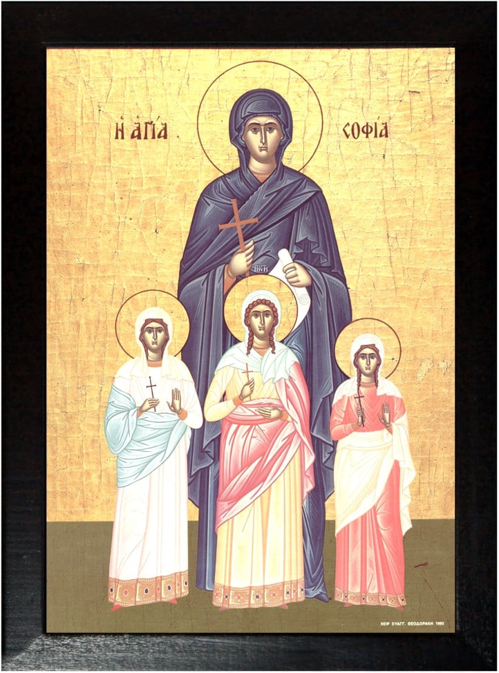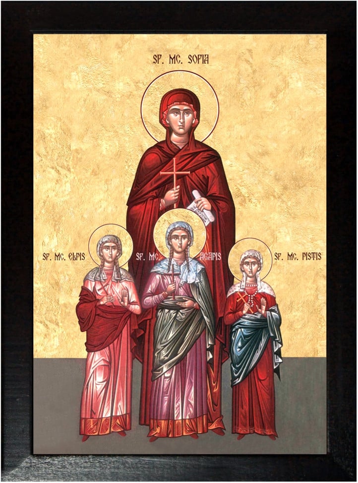 Pe timpul împărăţiei lui Adrian (117-138), împăratul rău-credincios al romanilor, era în Roma o văduvă de neam italian, anume Sofia, al cărei nume se tîlcuieşte "înţelepciune". Aceasta, după numele său, petrecea viaţa în credinţă creştinească, cu înţelepciune; o astfel de înţelepciune o laudă apostolul Iacov zicînd: "Înţelepciunea cea de sus întîi era curată, apoi paşnică, blîndă, bineplăcută, plină de milă şi de roade bune" (3,17). Această înţeleaptă Sofia, cînd trăia în însoţire legiuită, a născut trei fiice, cărora le-a pus numele celor trei virtuţi evanghelice: pe cea dintîi a numit-o Pistis (Credinţa), pe a doua Elpis (Nădejdea), pe a treia Agapi (Dragostea). Că ce altceva avea să nască înţelepciunea cea creştinească, dacă nu bunătăţile cele plăcute lui Dumnezeu? Dar, după naşterea acestor trei fiice a rămas văduvă în curînd, şi vieţuia cu dreaptă credinţă, plăcînd lui Dumnezeu, îndeletnicindu-se cu rugăciunea, cu postul şi cu milostenia înconjurată de cele trei fiice ale sale. Pe acestea le creştea într-o astfel de învăţătură, pe care ar fi putut să le-o dea numai o mamă aşa înţeleaptă, că purtînd numele bunătăţilor celor mari evanghelişti, nu trebuia mai mult decît să le deprindă pe fiecare din ele cu practica virtuţii al cărei nume îl purta, ceea ce s-a şi făcut. Crescînd ele cu anii, creşteau într-însele şi bunătăţile; şi au învăţat bine cărţile proorocilor şi ale apostolilor, s-au deprins la cuvintele învăţăturilor şi se nevoiau la citire, la rugăciune şi la osteneli casnice, supunîndu-se sfintei, de Dumnezeu înţelepţitei lor mame, sporind şi înaintînd de la o faptă bună la alta şi mai bună şi se suiau din ce în ce mai sus pe treptele scării morale.