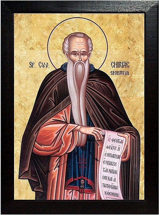Cuviosul Chiriac s-a născut în Corint, dintr-o familie credincioasă: tatăl său, Ioan, era preot al Bisericii sobornicești, iar mama sa se numea Evdochia. Venirea lui pe lume s-a petrecut în vremea împăratului Teodosie cel Mic, către sfârșitul domniei acestuia. Încă din copilărie a arătat daruri deosebite și s-a legat prin rudenie și prin credință de Petru, episcopul Corintului. Acesta l-a rânduit ca citeț în Biserică. Chiriac, având dragoste arzătoare pentru Sfintele Scripturi, își petrecea aproape tot timpul citind și meditând la lucrările minunate ale lui Dumnezeu, mirându-se cum, de la începutul lumii, Domnul a purtat de grijă mântuirii oamenilor. Își amintea de Avraam, de Moise, de David, de profeți și drepți, și se minuna mai ales de taina cea mare: nașterea Domnului din Fecioară și biruința Lui prin Cruce asupra iadului. Aceste gânduri l-au aprins cu dorința de a urma pilda celor plăcuți lui Dumnezeu.
