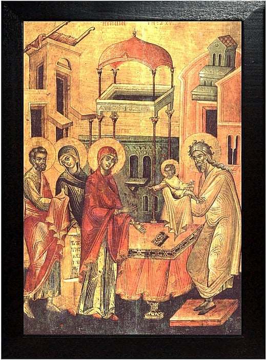 După Naşterea Domnului, trecînd patruzeci de zile şi împlinindu-se vremea curăţiei celei legiuite, Preabinecuvîntata Fecioară Maică vine la Ierusalim, în Biserica lui Dumnezeu, purtînd pe Hristos Pruncul cel de patruzeci de zile, au mers să împlinească Legea Domnului şi să se curăţească după naştere, prin aducerea jertfei celei cuviincioase lui Dumnezeu şi prin rugăciunea preotului.