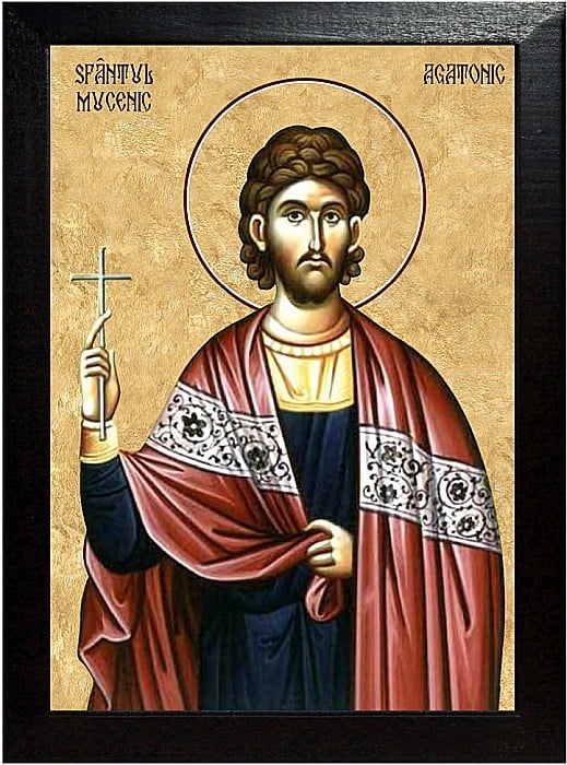 Sfantul Mucenic Agatonic a trăit în Nicomidia în timpul împăratului Maximian și a convertit mulți elini la creștinism. El a fost prins de comitul Evtolmie, care avea ordin să-i ucidă pe creștini în țara Pontului