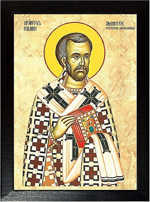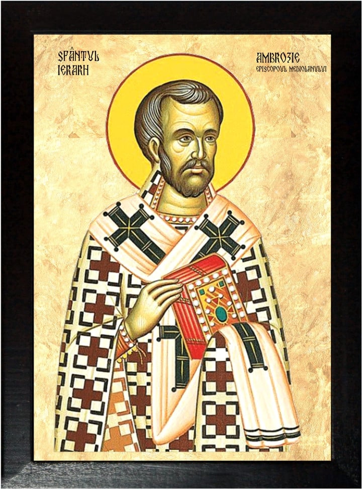 Sfântul Ierarh Ambrozie, Episcopul Mediolanului (cunoscut și ca Sfântul Ambrozie de Milano), este una dintre figurile centrale ale Bisericii creștine din Apus și un important teolog și păstor al creștinismului din secolul al IV-lea. Născut în jurul anului 340 în Trier (astăzi în Germania), Ambrozie provenea dintr-o familie nobilă și avea o educație aleasă, fiind pregătit pentru o carieră de magistrat și administrator în Imperiul Roman.