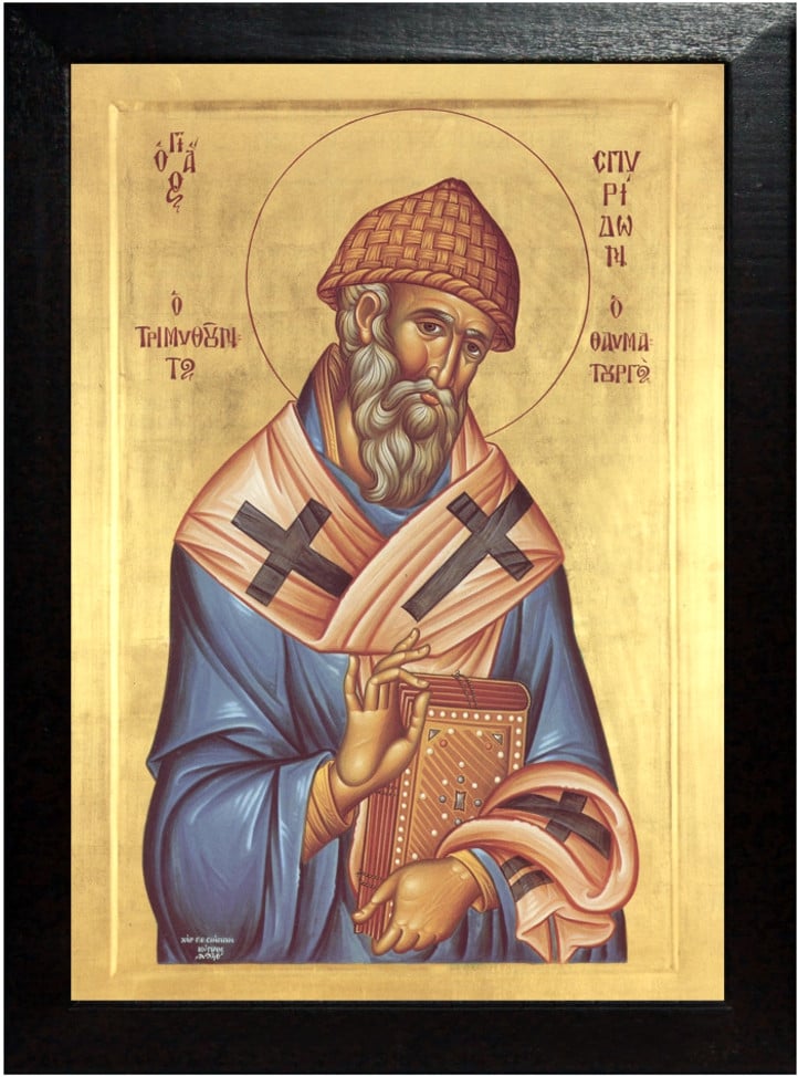 Insula Ciprului era patria minunatului Spiridon, care, născîndu-se din părinţi simpli, era şi el smerit cu inima şi bun cu viaţa. În copilăria sa a fost păstor de oi şi, crescînd, s-a împărtăşit nunţii celei legiuite şi s-a făcut tată de copii. El vieţuia cu cinste şi cu plăcere de Dumnezeu, urmînd lui David în blîndeţe, lui Iacob în simplitatea inimii şi lui Avraam în iubire de străini. Dar nu după mulţi ani, murindu-i soţia, cu osîrdie slujea lui Dumnezeu prin fapte bune, iar averea sa o cheltuia spre odihna străinilor. În lume atît de mult a plăcut lui Dumnezeu, încît s-a învrednicit cu darul facerii de minuni, căci vindeca tot felul de boli, din cele cu anevoie de vindecat şi izgonea duhurile rele din oameni, cu cuvîntul. Pentru aceasta a fost ales episcop al cetăţii Trimitundei, care era o cetate vestită a Ciprului, în împărăţia marelui Constantin şi a lui Constantie, fiul său, unde făcea minuni preaslăvite.