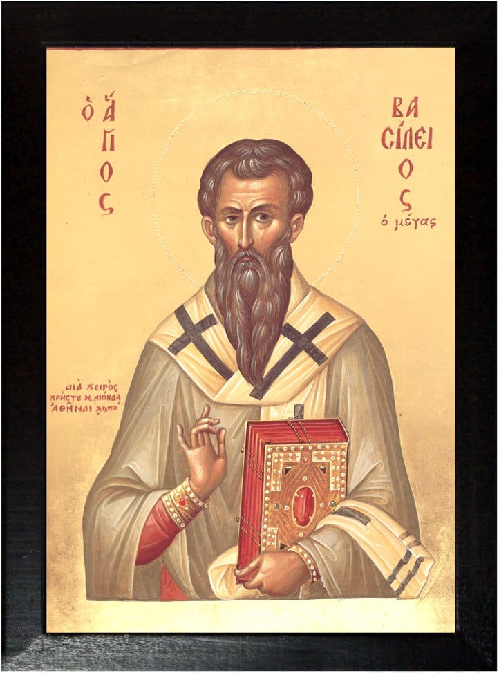 Sfantul Vasile a fost “un om foarte inalt la stat si drept ca o faclie, uscativ si slabit de ajunare si de veghere, oaches la fata, dar obrazul ingalbenit, nasul lunguiet, sprancenele cercuite si plecate, asemenea omului ganditor, fruntea incretita, umerii obrajilor iesiti, tamplele adancite, cam plesuv la par, cu barba destul de lunga, carunta pe jumatate”.