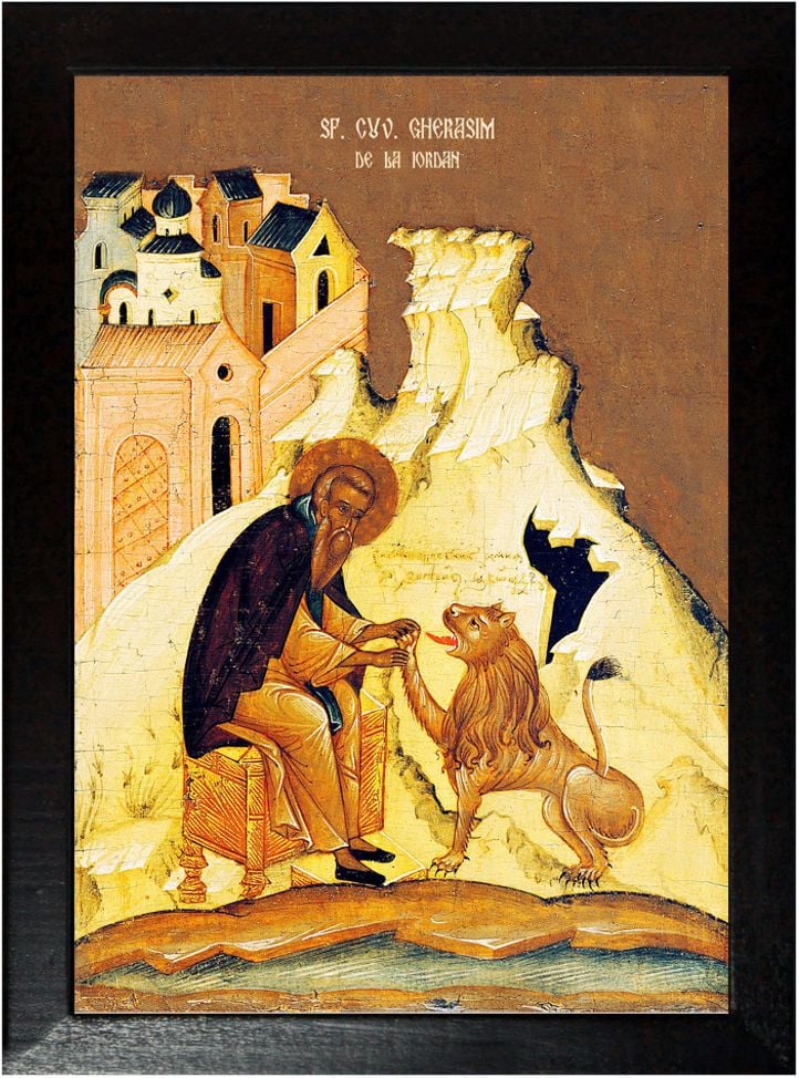 Sfântul Gherasim de la Iordan este unul dintre marii Părinți ai pustiei și stâlp al monahismului răsăritean, un model al sfințeniei, smereniei și iubirii desăvârșite. Născut în Lichia (Asia Mică) în secolul al V-lea, Sfântul Gherasim a fost crescut în dreapta credință și a primit o educație duhovnicească aleasă. De tânăr, dorind să se apropie de Dumnezeu prin nevoință, a ales calea pustniciei, retrăgându-se în pustiul Tebaidei, unde s-a supus unei vieți de aspră nevoință și rugăciune neîncetată.