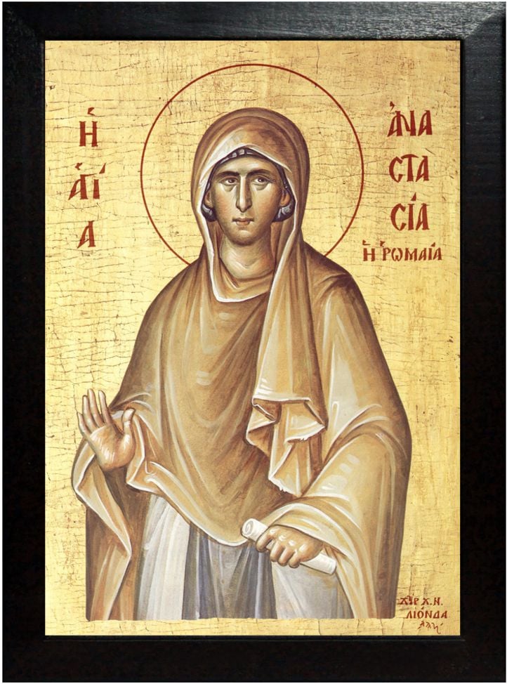 Sfanta Anastasia, fiind de prin părţile Romei,  rămânând orfană de părinţi la vârsta de trei ani, a fost luată de egumena Sofia, care a crescut-o într-o mănăstire, învăţând-o toate faptele bune, încât le covârşea pe toate celelalte fecioare, nu numai în frumuseţe, dar şi în post, în nevoinţe şi în toate celelalte osteneli.