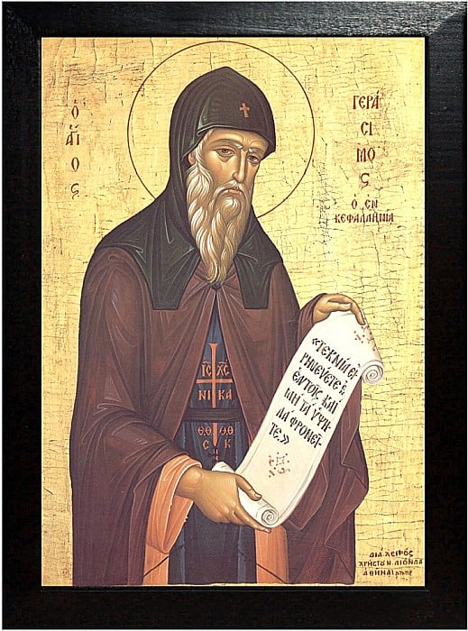Sfântul Gherasim s-a născut în jurul anului 1500 în satul Trikala din Tesalia, Grecia. La vârsta de 30 de ani, a intrat în viața monahală și a trăit o viață ascetică în diferite mănăstiri din Grecia. În cele din urmă, s-a stabilit pe insula Kefalonia, unde a trăit în rugăciune și smerenie într-o peșteră aflată pe malul mării.