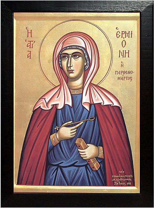 Sfânta Ermioni, fiica Sfântului Apostol Filip, unul dintre cei șapte diaconi menționați în Noul Testament. Ermioni, împreună cu sora ei Evtihia, pleacă în Asia în căutarea Sfântului Ioan Teologul. Neaflându-l, ele se întâlnesc cu Petroniu, un ucenic al Apostolului Pavel, care le învață virtuțile creștine.