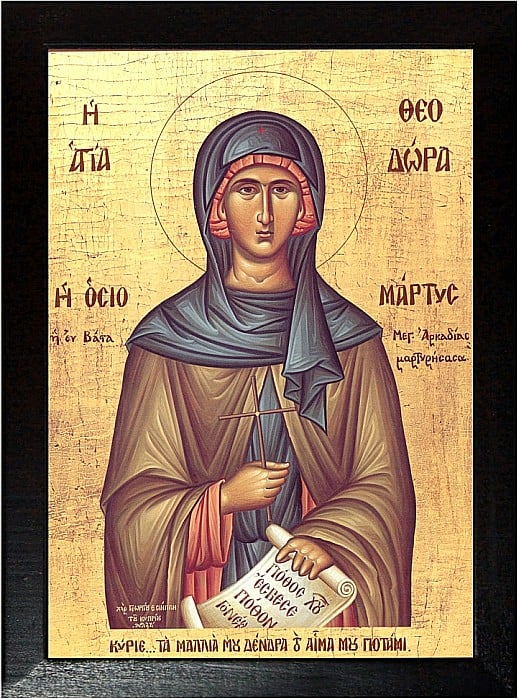 Sfânta Teodora s-a născut în Peloponez, în secolul al IX-lea, în timpul Imperiului Bizantin, într-o familie săracă dar credincioasă. De la o vârstă fragedă, ea s-a remarcat prin dragostea sa profundă pentru Dumnezeu, dorindu-și să-și dedice întreaga viață slujirii Lui. A decis să intre într-o mănăstire, însă nu una obișnuită de maici, ci a ales să se călugărească într-o mănăstire de călugări, prezentându-se ca bărbat sub numele de „Teodor”. În această mănăstire, Teodora s-a distins prin virtuți precum răbdarea, ascultarea și umilința, devenind un exemplu pentru ceilalți călugări.